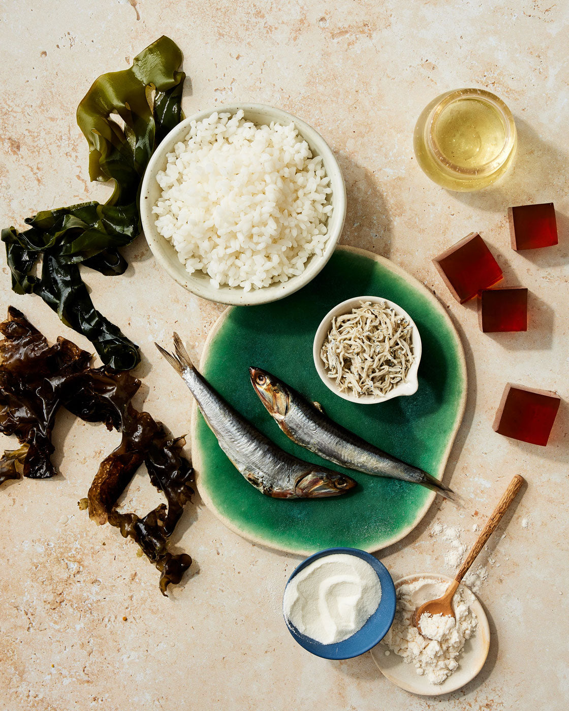 INGREDIENTS:  sushi rice porridge (water, sushi rice), algal oil, marine collagen, white anchovies, puppops skin & coat blend (MCT powder, zinc citrate, biotin),  raw nori, grass-fed beef gelatin